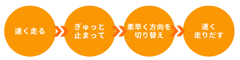 野球の打った後の方向を変えながら走る動作やサッカーやバスケットボールの攻守の切り替えで方向転換、バレーボールで味方のレシーブが思わぬ方向へ行き急いでボールを追いかける、テニスのラリーで振られた時に一歩でも遠くへ!